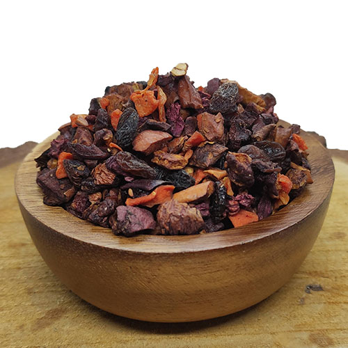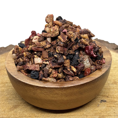 Lesní poklad je bohatá a komplexní ovocná směs, která v sobě ukrývá to nejlepší z lesních hvozdů. Kombinace borůvek, ostružin, malin a bezinek vytváří hlubokou, temně červenou barvu nálevu a chuť, která je plná, vrstevnatá a dokonale vyvážená mezi sladkostí a kyselostí. Každý doušek je jako procházka lesem, kde voní jehličí a zralé plody. Základ z ibišku a šípku dodává čaji tělo a množství vitamínu C, což z něj činí skvělého pomocníka pro posílení imunity, zejména v chladnějších měsících. Tento "poklad" si zamilujete pro jeho intenzitu a schopnost zahřát i osvěžit. Je to poctivý ovocný čaj, který chutná skvěle sám o sobě, ale snese i lžičku medu pro zvýraznění lesních tónů. Dopřejte si kousek divoké přírody v pohodlí domova.